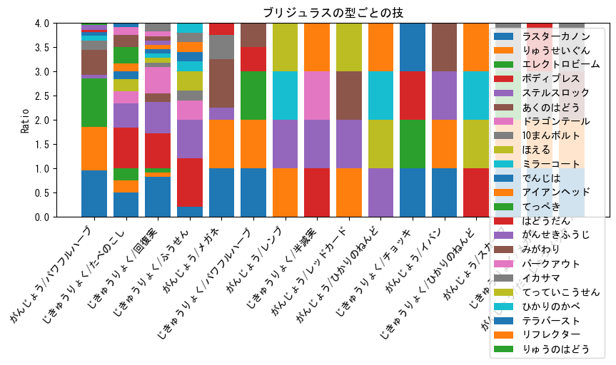 受け性能の評価では、ダメージを技の使用率で重みづけしたものの合計で評価しています。